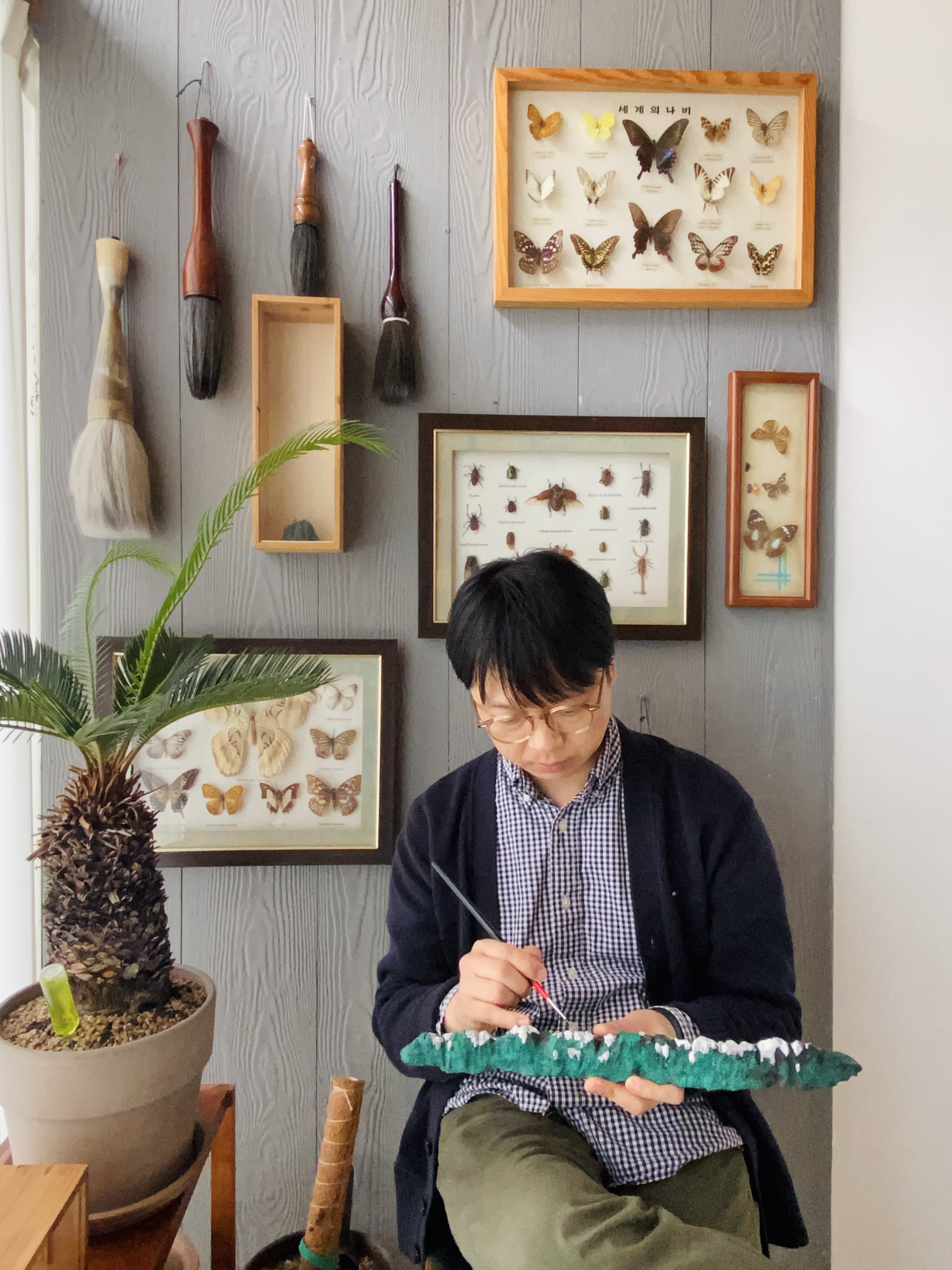 방진태(1984년생)는 일상의 풍경 속에서 마주할 수 있는 산의 모습을 그리는 작가다. 그는 특별한 명산이 아닌, 스쳐 지나갈 수 있는 산의 형상을 통해 인간의 ‘소유’에 대한 욕망과 자연의 의미를 탐구한다. 거대한 산을 방 안에 옮겨둘 수 없기에 그림으로 간직하고자 하는 마음에서 출발한 그의 「채집된 산수」 시리즈는, 자연을 채집하듯 담아낸 산의 표본과도 같다. 작가는 산을 오르거나 내려다보기보다 평지에서 멀리 바라보며 변화하는 형태를 관찰하고, 그 보폭 속에서 얻은 감각을 화면에 옮긴다. 실경을 재현하기보다 경험을 통해 느낀 형상을 표현하며, 산을 자유와 해방의 상징으로 그려낸다.